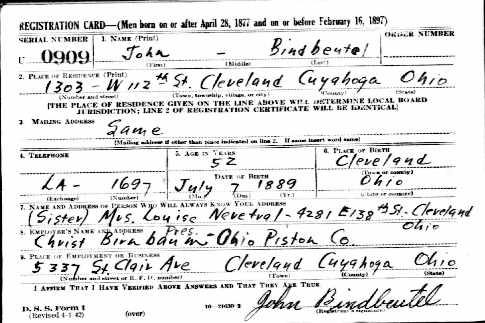 World War II Draft Registration Card of John Bindbentel