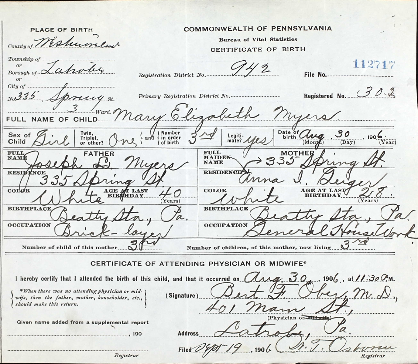 Certificate of Birth of Mary Elizabeth Myers