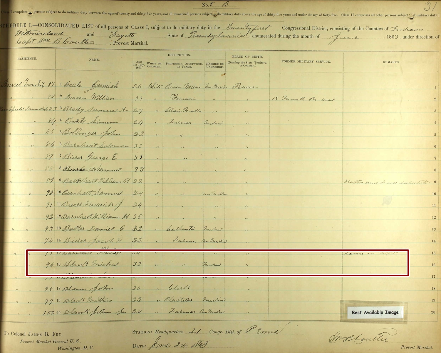 Civil War Draft Registration of Michal Blank