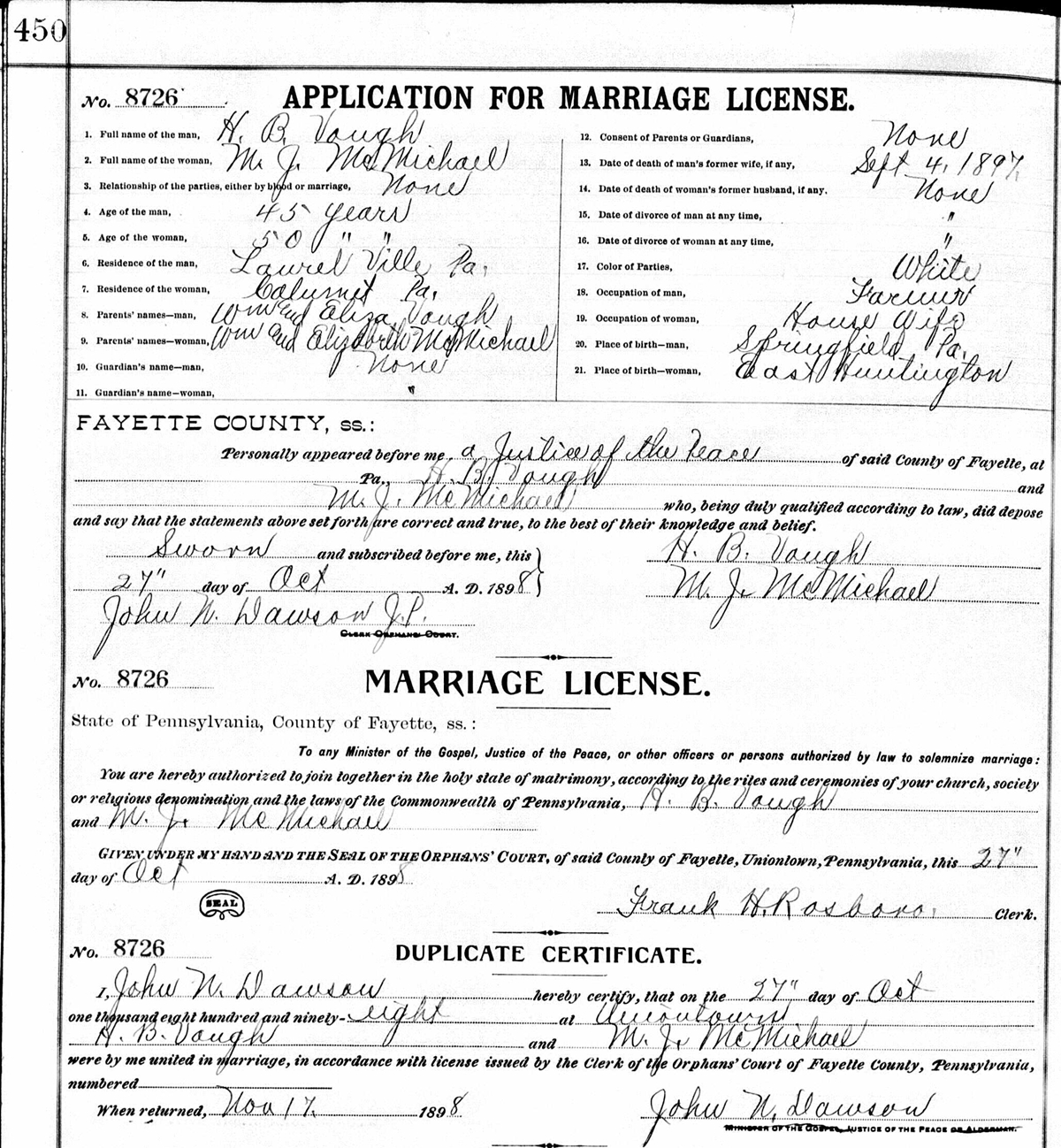 Marriage Record of M. J. McMichael and H. B. Vaugh