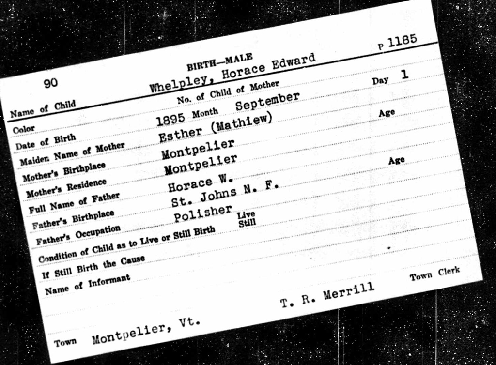 Birth Record of Horace Edward Whelpley