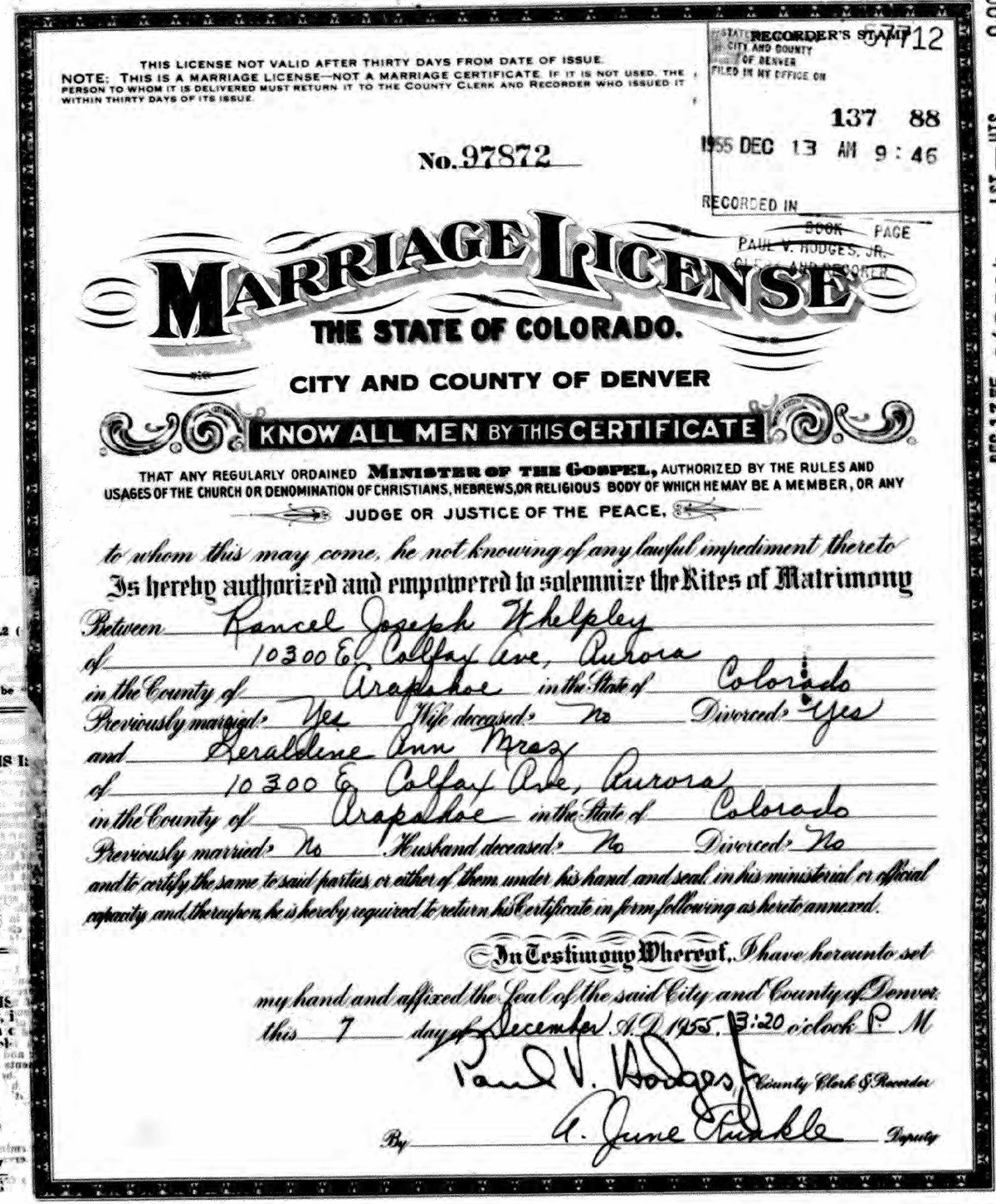 Marriage License of Rancel Whelpley and Geraldine Mraz