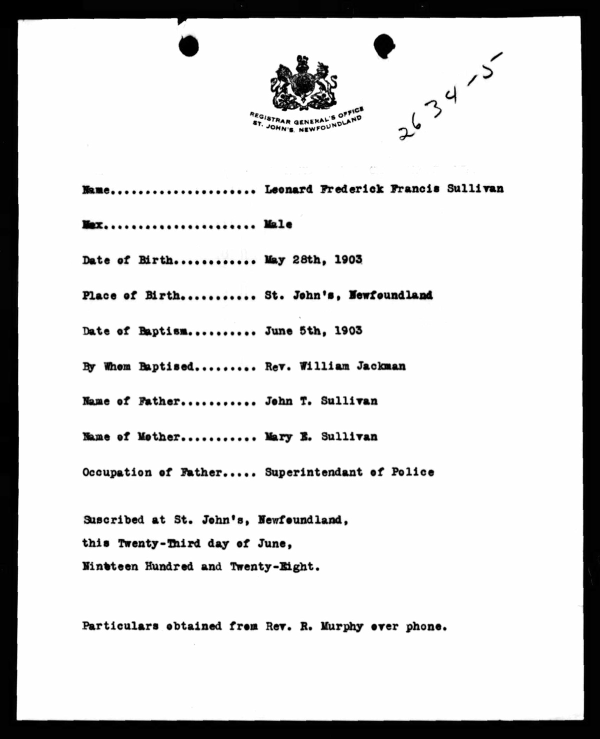 Birth Record of Leonard Frederick Francis Sullivan