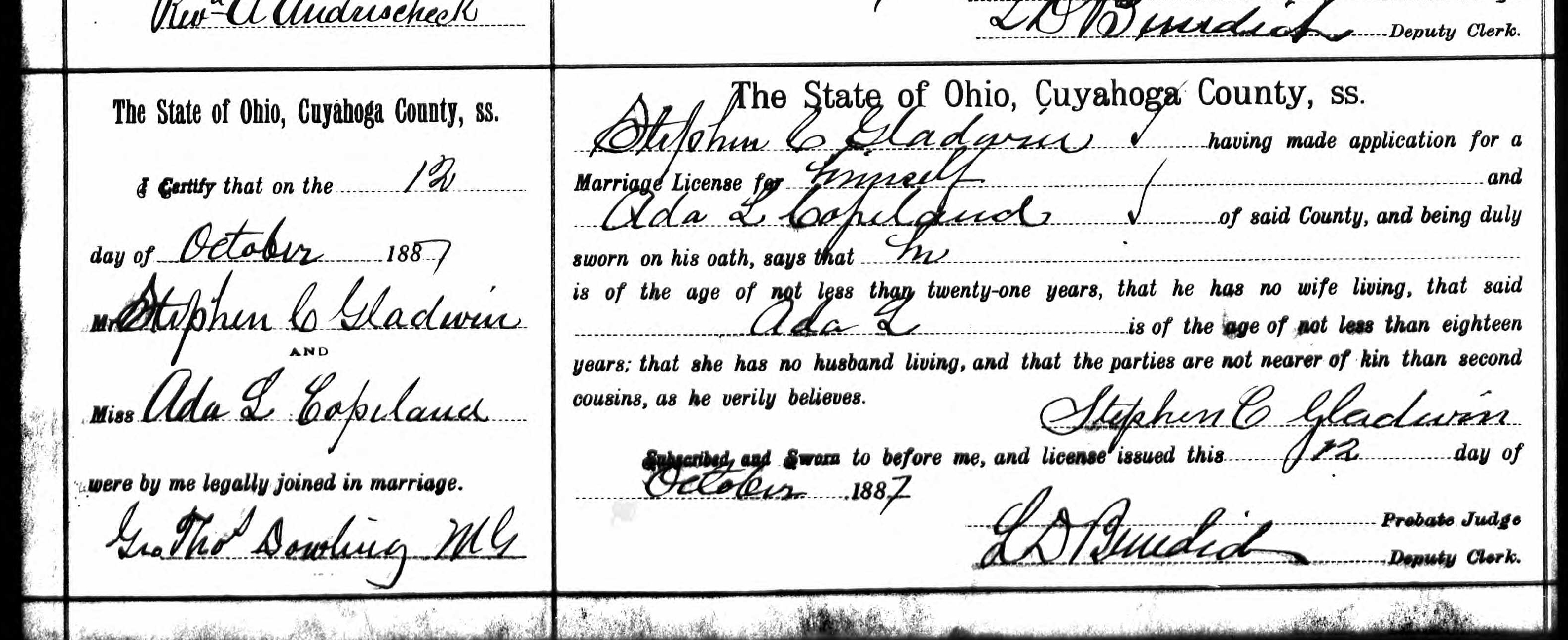 Marriage Record of Ada L. Copeland and Stephen C. Gladwin