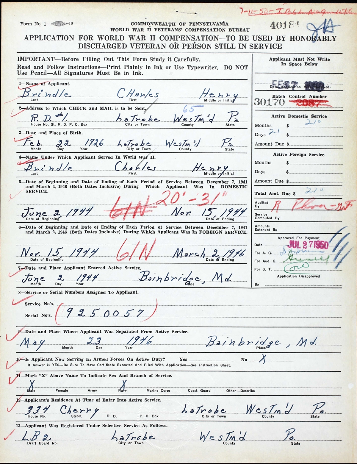 World War II Compensation Application of Charles Henry Brindle