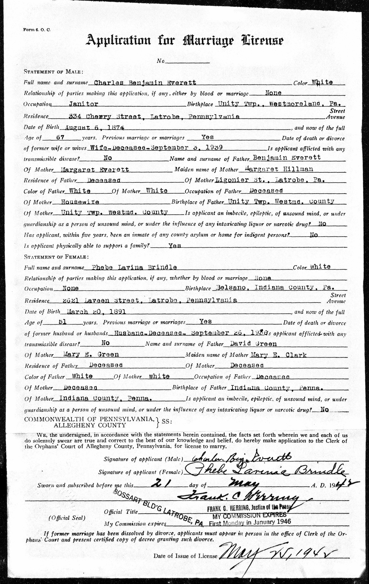 Application for Marriage License for Phebe Brindle and Charles Everett