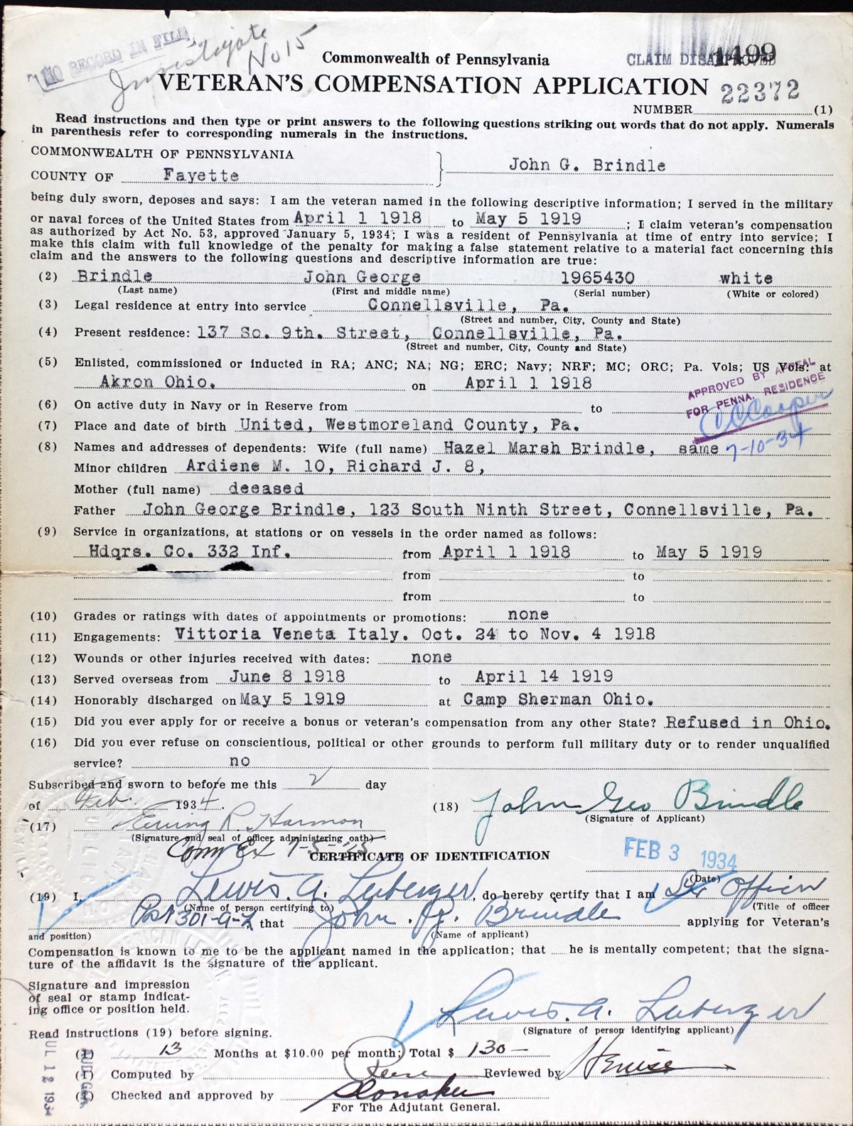 Veteran's Coppensation Application of John George Brindle