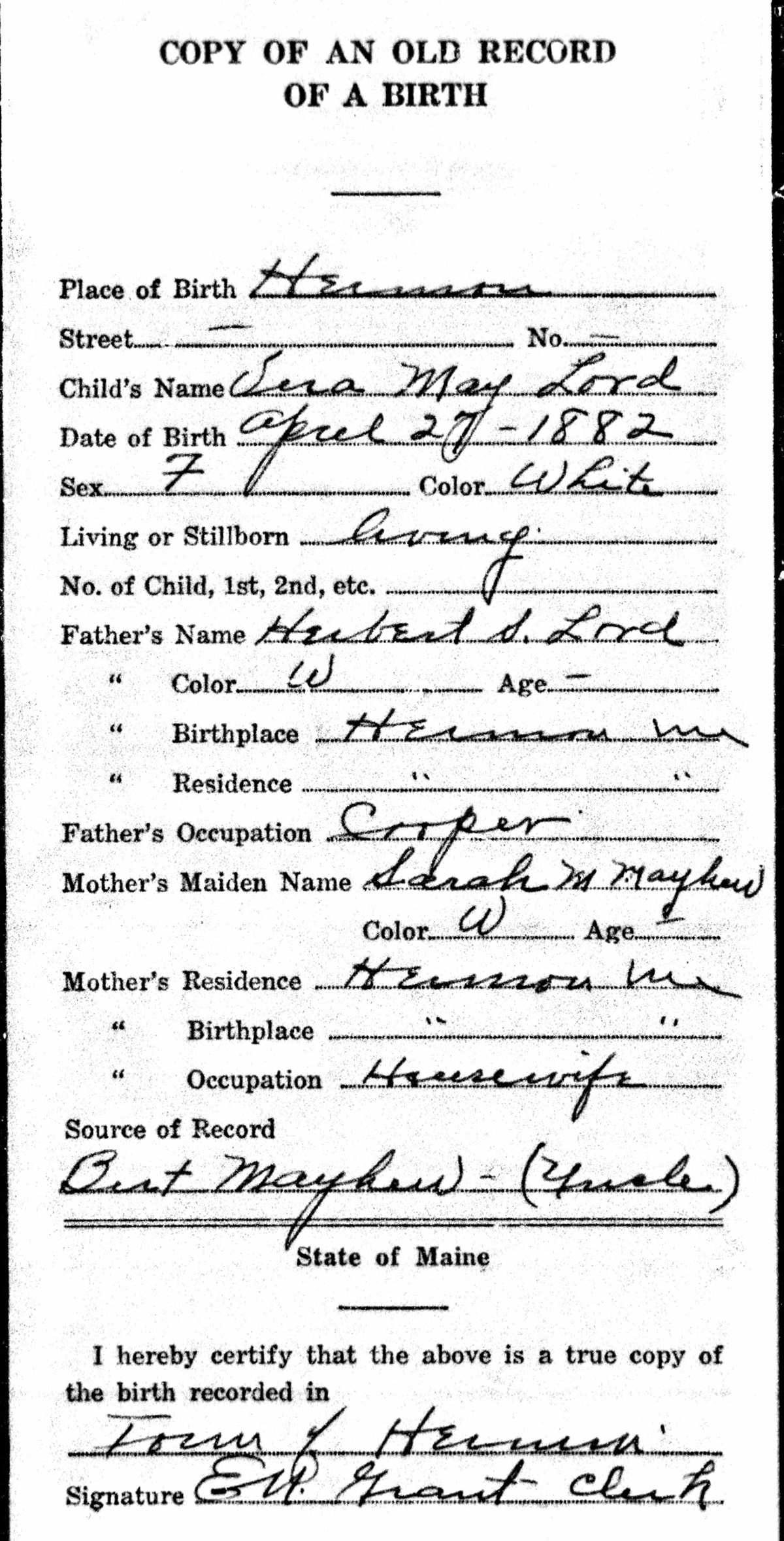 Birth Record of Vera May Lord