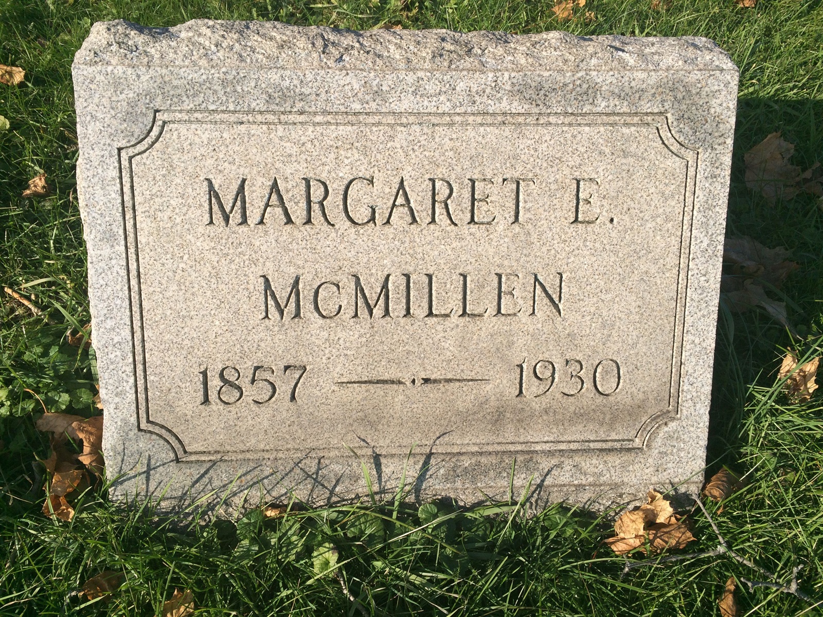 Margaret Emma Green was born on 16 April 1857 at Pennsylvania. She was the daughter of David E. Green and Anna Barbara Mack. Margaret Emma Green went by the nick-name of Emma. Sheappeared on the US Census of 1860 in the household of David E. Green and Anna Barbara Mack at East Wheatfield Township, Indiana County, Pennsylvania.1 Margaret Emma Greenappeared on the US Census of 1870 in the household of David E. Green and Mary Jane Clark at Buffington Township, Indiana County, Pennsylvania.2 As of 8 September 1881,her married name was McMillen.