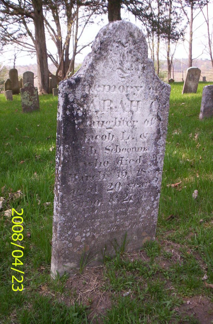 Sarah Catherine Schoonmaker was born on 18 September 1814 at Marbletown, Ulster County, New York. She was the daughter of Jacob L. Schoonmaker and Sarah Snyder. Sarah Catherine Schoonmaker was christened on 26 March 1815 in the Marbletown, Ulster County, New York. She died on 15 March 1835 at Marbletown, Ulster County, New York, at age 20. Sarah was buried at Marbletown Cemetery, Marbletown, Ulster County, New York.