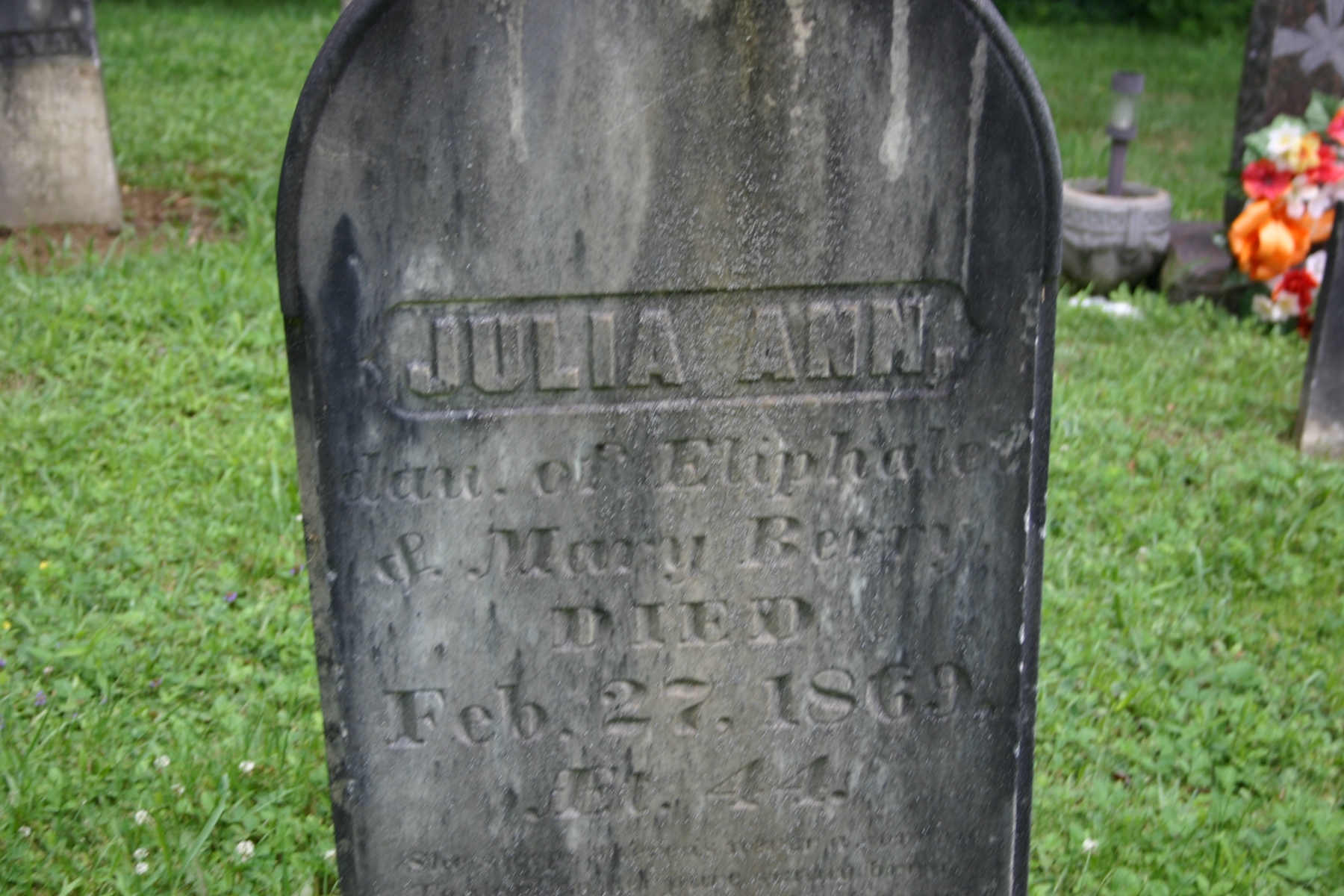 Julia Ann Berry was born in 1825 at Maine.2,3 She was the daughter of Eliphalet Berry and Mary P. Kimball.1 Julia Ann Berryappeared on the US Census of 1850 in the household of Eliphalet Berry and Mary P. Kimball at Palmyra, Maine.3 According to the Federal Census in 1850, Julia was "deaf and dumb."3 Sheappeared on the US Census of 1860 in the household of Eliphalet Berry and Mary P. Kimball at Palmyra, Maine.4 According to the Federal Census in 1860, Julia was "deaf and dumb."4 She died on 27 February 1869 at Palmyra, Maine.1,5 Julia was buried at Spring Hill Cemetery, Palmyra, Maine.5