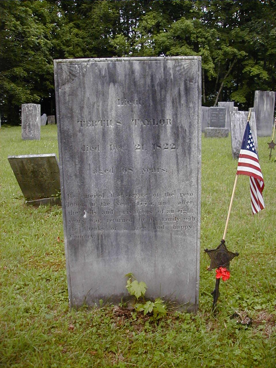 Lt. Tertius Taylor was born on 25 July 1754 at Charlemont, Massachusetts.1,3,2 He was the son of Captain Orthniel Taylor and Martha Arms.2 He was an officer in Gen.Washington's Army, and was at White Plains, Saratoga, Stillwater and at the storming of Stony Point. Served in the Continental line - sergeant, ensign, lieutenant.1,3,4,5