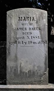 Maria Durham married James Oakes, son of Flower Oakes and Mary Margaret Donley. Her married name was Oakes. Maria, age 33 years, and James Oakes, age 48 years, appeared on the US Census of 1850 at Delaware Township, Northumberland County, Pennsylvania.2 Maria, age 43 years, and James Oakes, age 58 years, appeared on the US Census of 1860 at Delaware Township, Northumberland County, Pennsylvania.4 Maria Durhamappeared on the US Census of 1870 in the household of James Bruce Oakes at Delaware Township, Northumberland County, Pennsylvania.5 Maria Durhamappeared on the US Census of 1870 in the household of James Bruce Oakes and Rachel Anne Beard at Delaware Township, Northumberland County, Pennsylvania.5 Maria Durham died on 5 April 1881 at White Deer Township, Union County, Pennsylvania, at age 64.3,1 She was buried at Warrior Run Church Cemetery, Delaware Run, Northumberland County, Pennsylvania, in plot A-11L. Maria's epitaph reads: