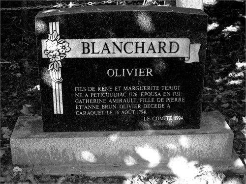 Captain Oliver Blanchard married Catherine-Joséphe Amirault dite Mirau, daughter of Pierre Amireau and Anne Brun, circa 1752.1 Oliver was a carpenter.1 The government of Nova Scotia, on 29 March 1784, granted 14,150 acres in one block to thirty-four French families. He was one of them, making him one of the founders of Caraquet.3 He died on 16 August 1796 at Caraquet, New Brunswick, Canada.1,2 Oliver was buried at Cimetière du Bocage, Caraquet, New Brunswick, Canada.2